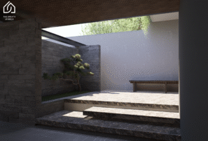 Biệt thự này được thiết kế dựa trên tương tác giữa không gian mở, bán mở và khép kín, với ba sân ngoài trời và một sân trong, tạo nên một tiểu khí hậu trung gian giữa bên trong và bên ngoài. Sự sắp xếp theo trục bắc-nam không chỉ tối ưu ánh sáng và tầm nhìn, mà còn dẫn dắt trải nghiệm từ không gian công cộng đến bán công cộng, từ sảnh hiên trung tâm đến các khu vực riêng tư.
